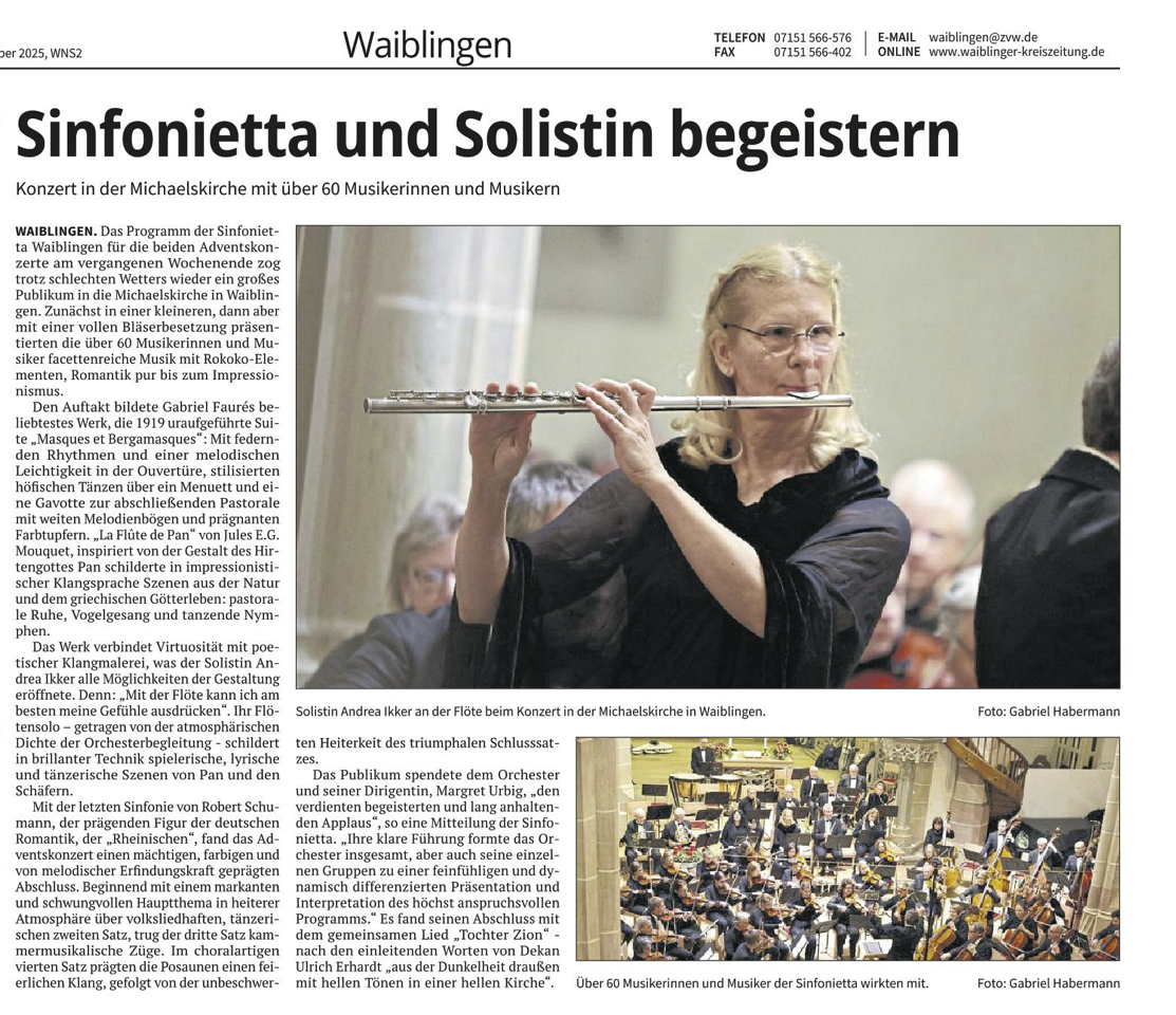 Am 6. und 7. Dezember gab die Sinfonietta ihr diesjähriges Adventskonzert in der Michaelskirche. Hier der Bericht der WKZ vom 10. Dezember: