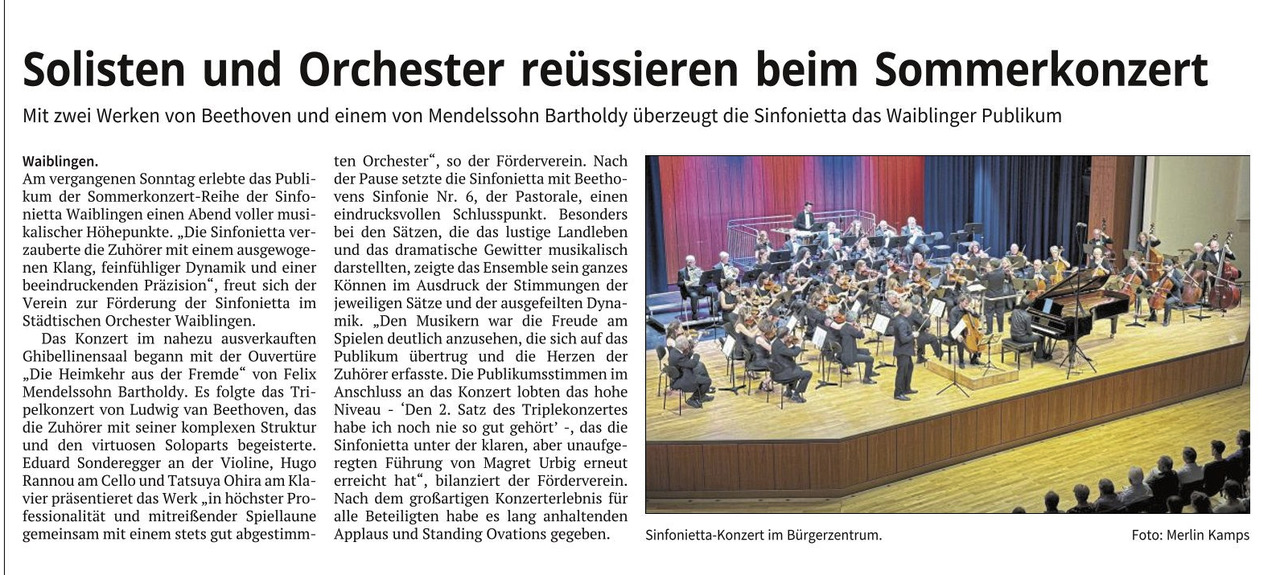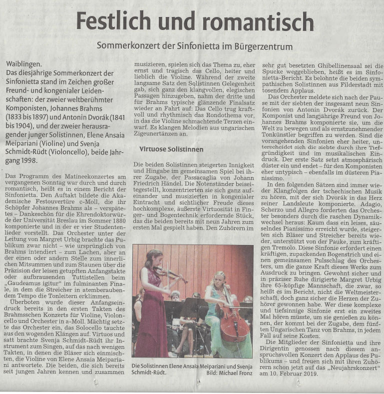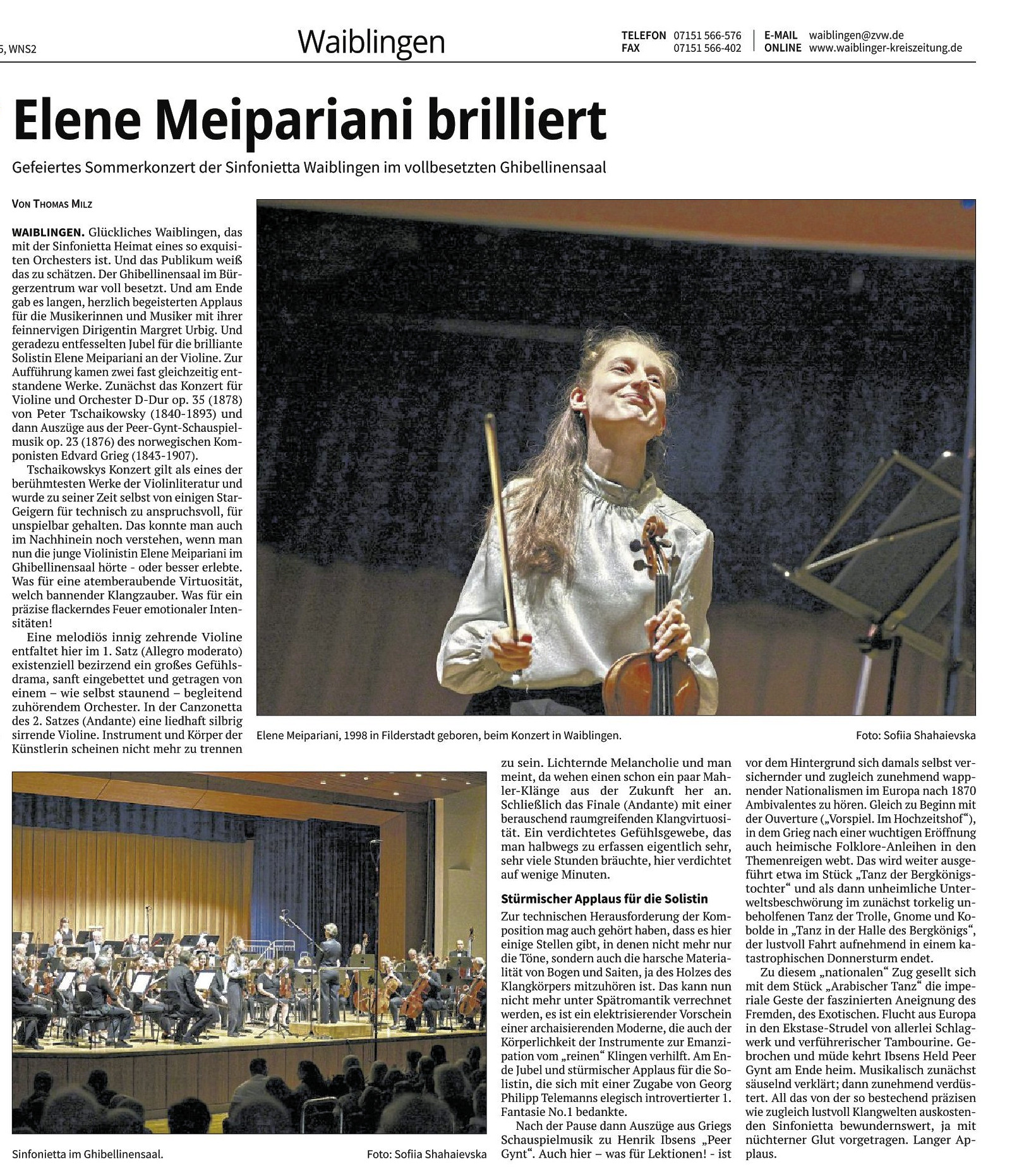 Waiblingen hat am Sonntag, 13. Juli, ein großartiges Konzert erlebt mit zwei Werken, die in ihrer Art einmalig sind. Vor allem die junge Solistin Elene Maipariani hat mit ihrer souveränen, ausdrucksstarken und mitreißenden Präsentation des Violinkonzertes von Pjotr Tschaikowsky das Publikum mitgerissen. Auch die Sinfonietta mit ihrer Dirigentin Margret Urbig bewies erneut ihre herausragende technische und musikalische Qualität in der Begleitung der Solistin und der Interpretation der Peer Gynt-Suite.
