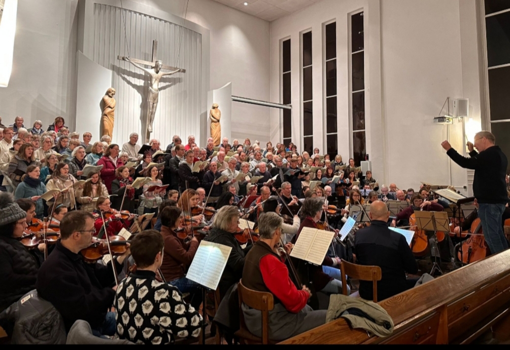 Chor, Orchester und Solisten, die sich ja vorher noch nicht getroffen hatten, mussten sich in zwei intensiven Proben auf den gemeinsamen Auftritt vorbereiten, was sehr schnell gelang, so dass sie gut eingespielt und eingesungen die beiden Konzerte am Freitag und Samstag angehen konnten. Die Marktkirche war am ersten Abend gut und am zweiten Abend fast bis auf den letzten Platz gefüllt. Anhaltender Beifall der Konzertbesucher bestätigte das hohe Niveau der dargebotenen Musik. So konnten nach der zweiten Aufführung die Chor- und Orchestermitglieder noch einige Stunden im Gemeindehaus der Pfarrei das gemeinschaftliche Erlebnis feiern, die Köstlichkeiten des von den Chormitgliedern bereiteten Buffets genießen, sich unterhalten und Erfahrungen austauschen.