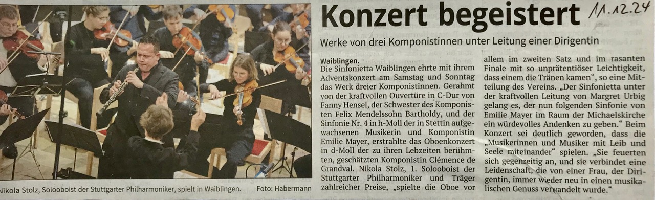 Das diesjährige Adventskonzert der Sinfonietta war wirklich etwas Besonderes: drei zum Teil noch nicht so bekannte Werke von Komponistinnen, eine großartig aufspielende Sinfonietta und ein wunderbarer Solist ließen in der an beiden Abenden sehr gut besuchten Michaelskirche eine musikalisch und emotional spannungsgeladene Stimmung aufkommen. Sie hielt bei vielen Besuchern noch lange nach den letzten Takten des Konzertes an. Hier der Bericht der Waiblinger Kreiszeitung: