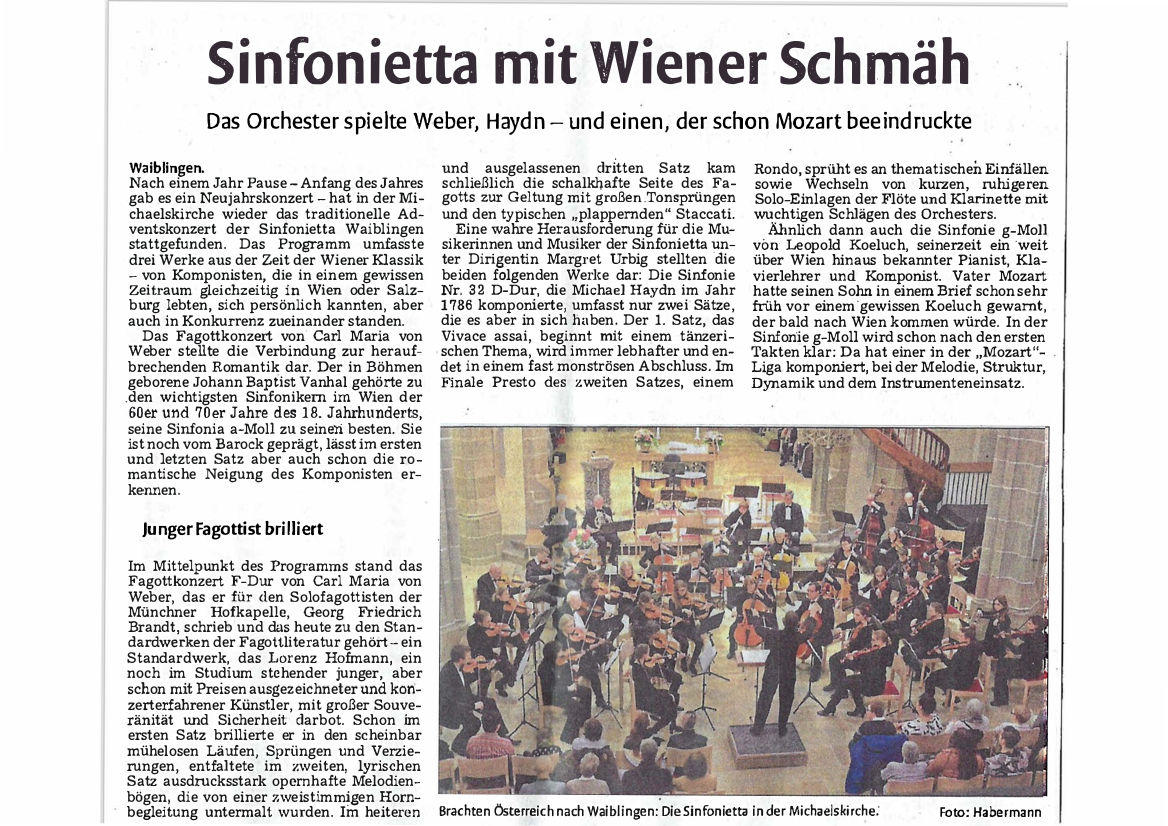 Am 6. und 7. Dezember gab die Sinfonietta ihr diesjähriges Adventskonzert in der Michaelskirche. Hier der Bericht der WKZ vom 10. Dezember: